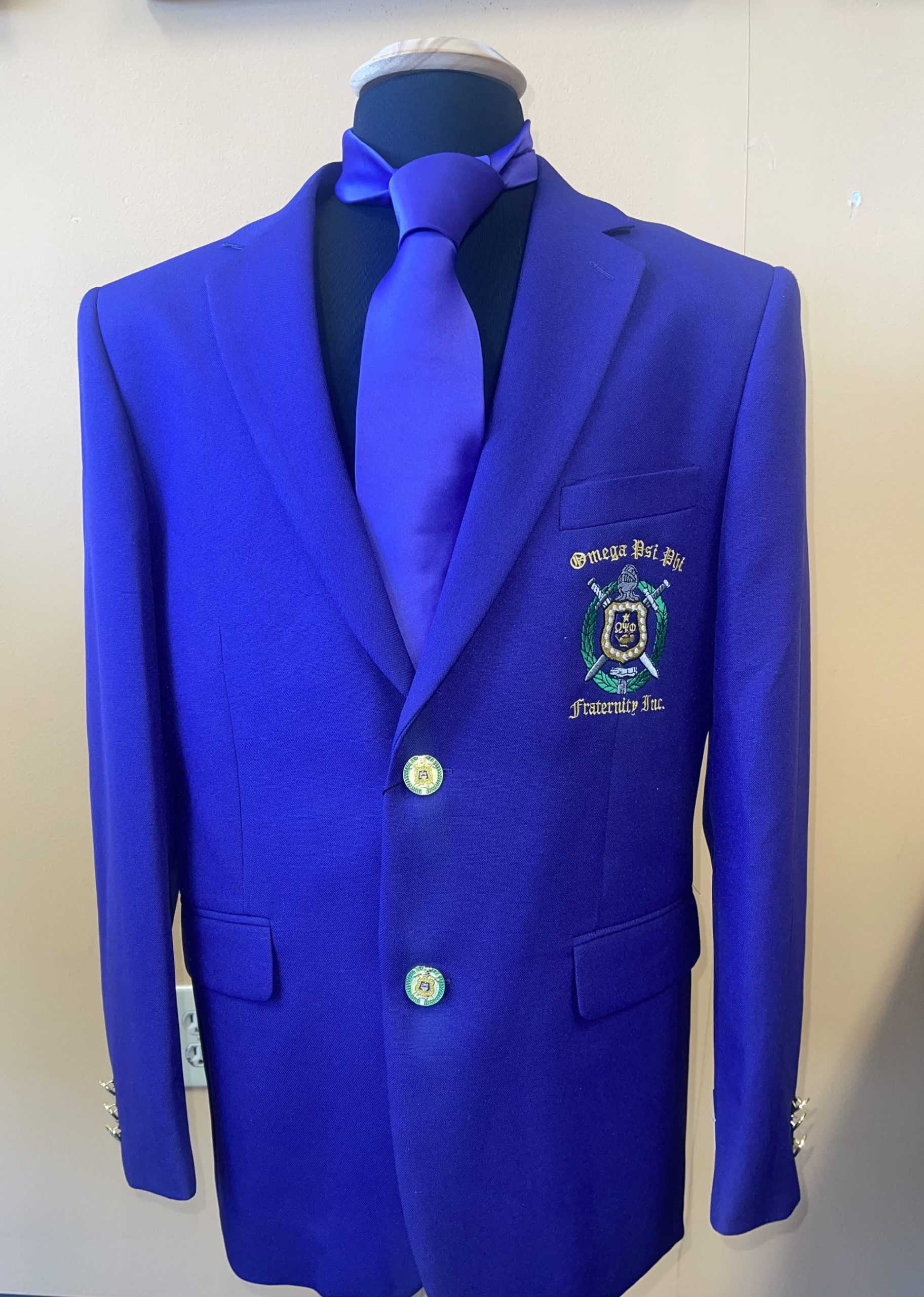 L & O Greek introduces the new Omega Blazer updated just for the men of Omega. It features the Omega Escutcheon and Omega buttons. The lining of the blazer also sports the Omega Escutcheon. The sizes range from 36R to 66L. It also comes with a garment bag and purple tie. Please place size in remarks column.